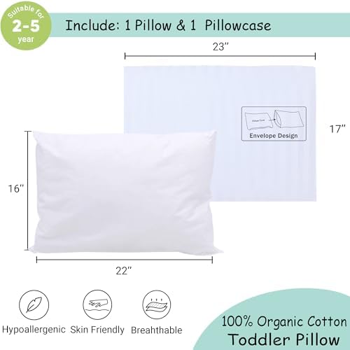 ZPECC Toddler Pillow with Pillowcase – 13×18 Organic Cotton Hypoallergenic Kids Pillow, Baby Essentials for Travel Crib Daycare Stroller (Intended for Age 2 and up) White Stripe